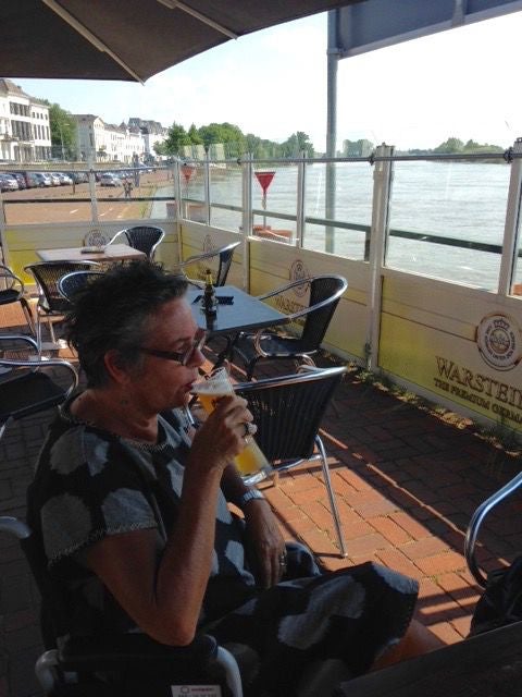 En Everdien krijgt ook meer zin om dingen te doen, met de rolstoel naar Albert Heijn of gisteren met dit mooie weer naar een terrasje aan de IJssel een pilsje drinken. Nu was de hele week de temperatuur wel goed alleen kwamen er telkens fikse buien in de middag. Maar nu geweldig weer om een terrasje te pakken of op ons eigen terras te zitten.