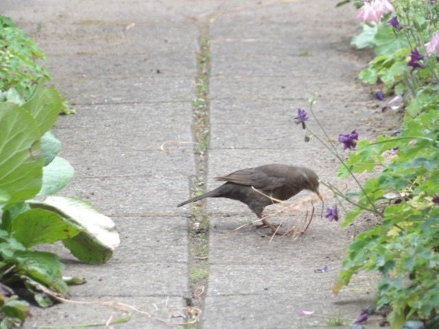 Maar dan zingt de merel vandaag weer prachtig in de boom 5 meter van ons huis verwijderd en dan is het weer goed. De merels zijn nu een nest aan het bouwen in onze heg, ze zijn er druk mee in de weer, ze vliegen af en aan met nestmateriaal voor een deel afkomstig uit onze tuin van de bladeren van de uitgebloeide blauwe druifjes.