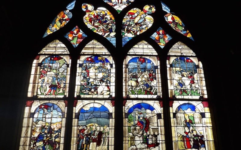 gebrandschilderde ramen met veldslagen erop afgebeeld, kathedraal Notre Dame