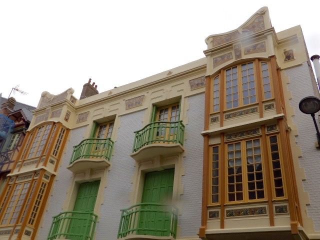 We zijn eerst naar Mers les Bains gewandeld voor de villa’s aan de boulevard en de zijstraten. Het was weer prachtig om te zien, de vormen maar ook de kleuren, hoewel ze niet allemaal even goed onderhouden worden. De verf heeft hier aan zee natuurlijk wel te lijden en omdat een villa vaak in verschillende kleuren is geschilderd is het onderhoud nogal kostbaar. De meeste villa’s hebben een naam. Er staan hier zeker 300 villa’s versierd met mooie balkonnetjes en erkers vaak van hout, emaille panelen, keramiek en sommige zijn versierd met wat Jugendstil elementen.