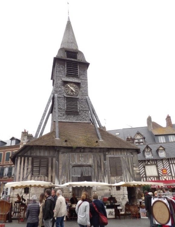 We zijn nog in de Sainte Catherine kerk geweest waarvan het interieur geheel uit hout bestaat en van buiten ook voor een groot deel. De oorspronkelijk kerk was van steen en werd tijdens de 100 jarige oorlog vernield en aan het eind van de15e eeuw weer herbouwd. Dit moest goedkoop gebeuren en werd uitgevoerd door scheepstimmerwerklieden met eikenhout. Dat zie je ook aan de vorm binnen , spanten als van 2 omgekeerde scheepsrompen. Er is ook wat fraai houtsnijwerk en mooie gebrandschilderde ramen.
