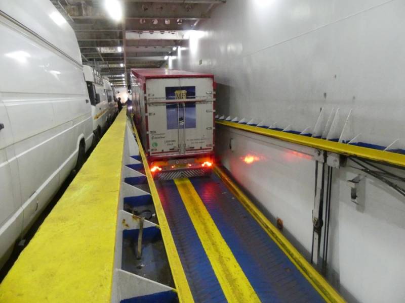 Uiteindelijk zijn we om 17.30 aan boord gegaan, toen moesten er nog de nodige vrachtwagens inschepen.
