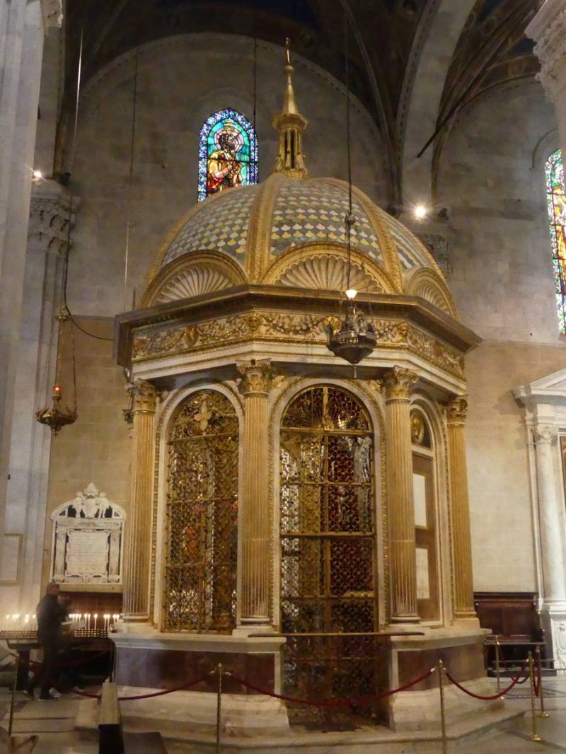grote schilderijen en beeldhouwwerken. Ook is er een graftombe van een ons onbekende dame die fraai is om te zien. Als je de kerk binnenkomt, is er rechts het beeld van ‘San Martino en de arme man’, San Martino zit op een paard en geeft een aalmoes.