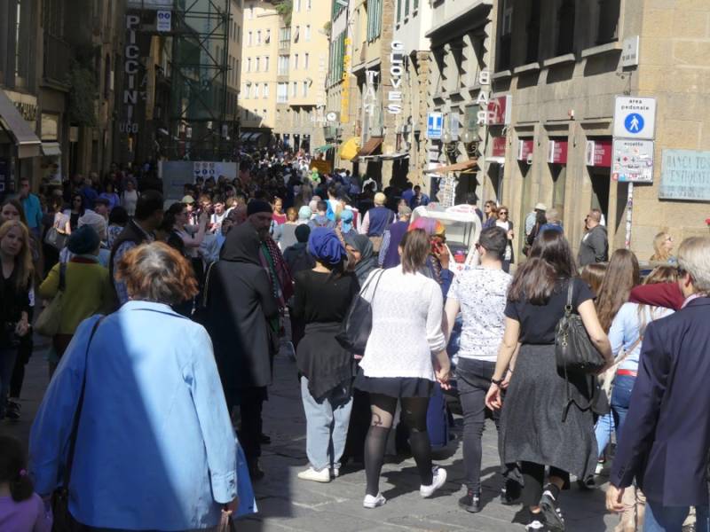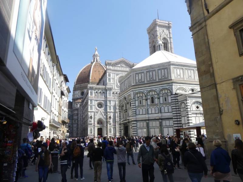 Want wat was het druk, we moesten ons een weg banen door een ijsjes etende, selvies makende toeristenstroom waarin niet alleen Japan rijkelijk was vertegenwoordig maar we hoorden allerlei talen spreken. Misschien komt het door de paasvakantie dat het zo druk was, het is natuurlijk altijd wel druk in Florence.