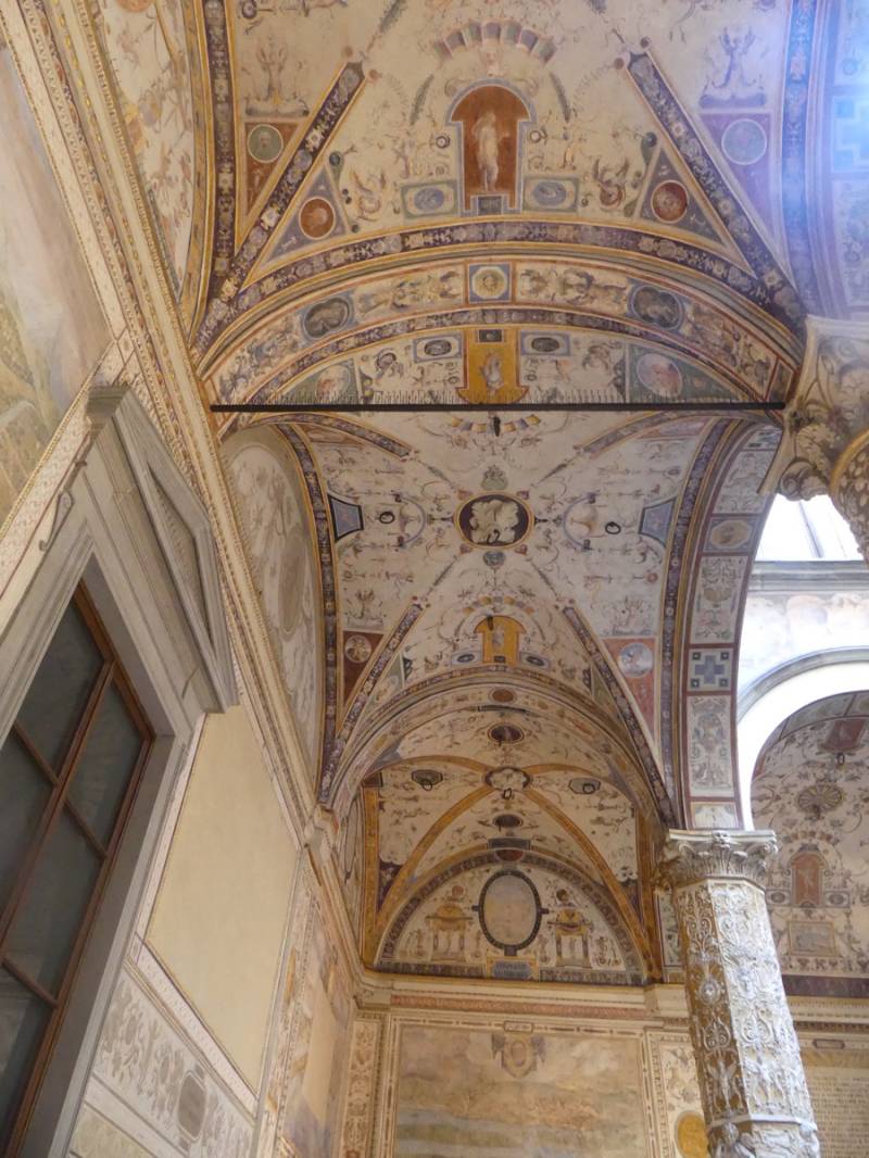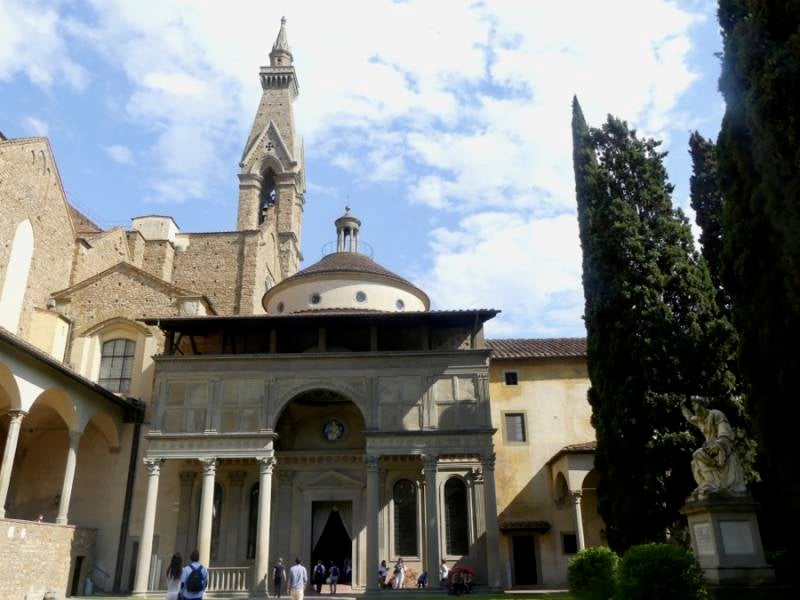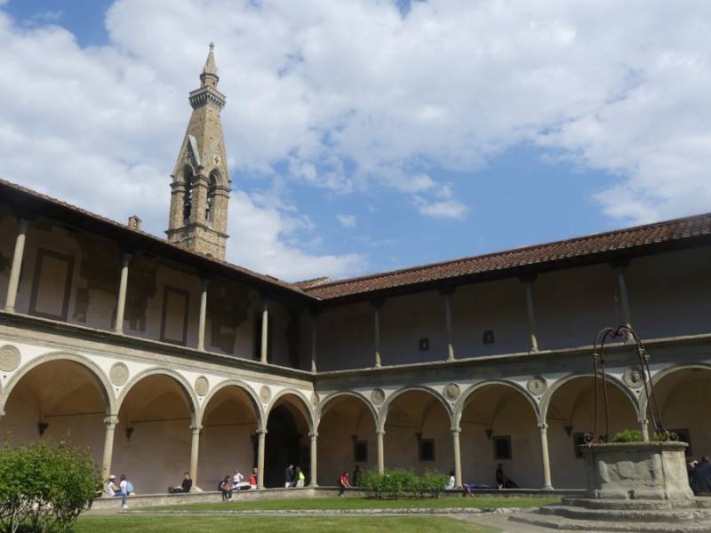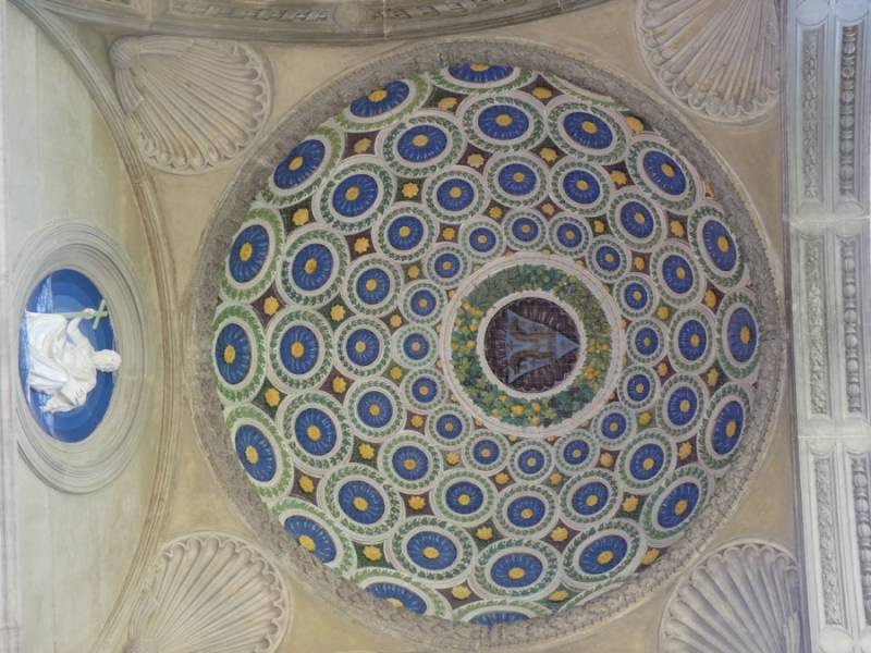 In de kloostergang die bij de kerk hoort ligt een mooie kapel van Brunelleschi,( die van de koepel van de dom) een van de meesterwerken uit de renaissance in Florence. In een koepel in de kloostergang voor de kapel is een mooie decoratie die ons aan een omgekeerd Marokkaans bord deed denken.
