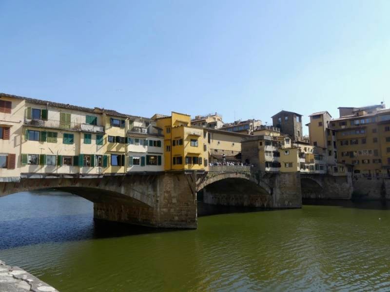We zijn langs het grote museum Uffizi gelopen, die hebben we nog nooit bezichtigd en ook nu niet , er stonden weer lange rijen voor de kassa en het was prachtig zomerachtig weer. We zijn verder gewandeld naar de middeleeuwse brug (1345) Ponte Vecchio. Die trekt hordes toeristen vanwege de juwelierswinkeltjes die op de brug gevestigd zijn. Die zijn aan ons niet besteed, we vinden de brug leuk aan de buitenkant waar je de uitbouw van de winkeltjes aan de brug kunt zien ‘hangen’. En vanwege de blik over de Arno en de huizen erlangs vanaf de brug.