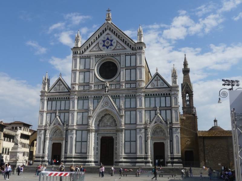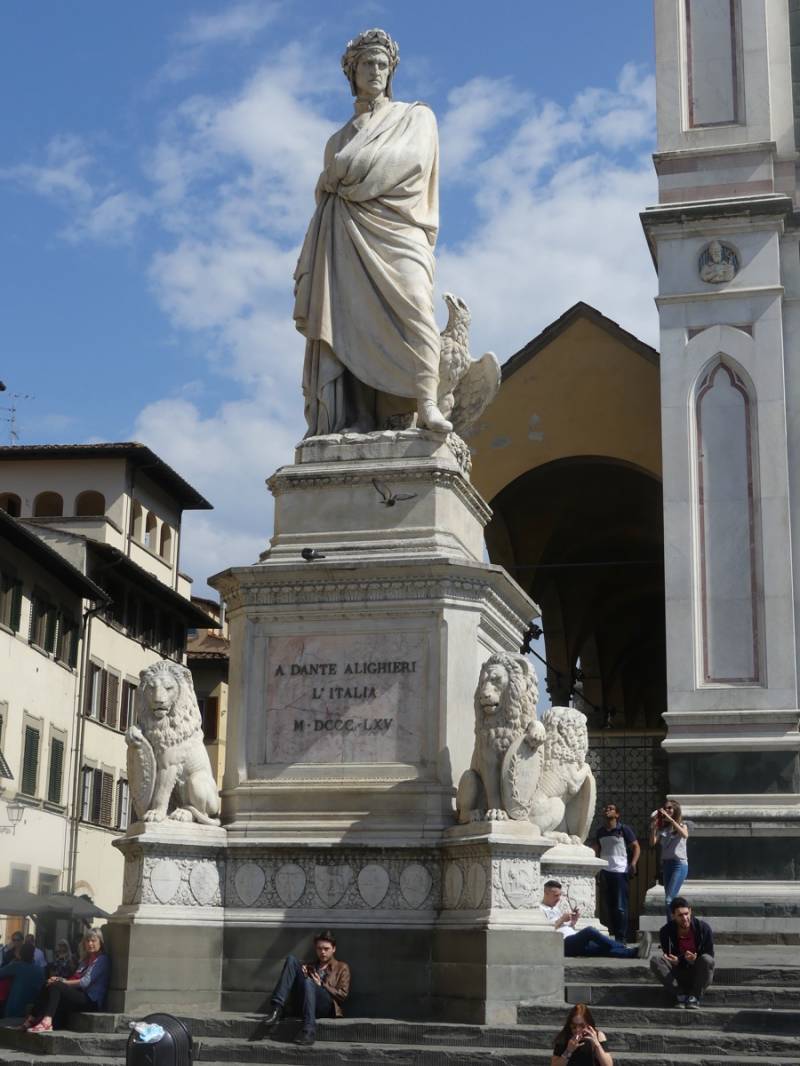 Gelukkig niet voor de mooie kerk Santa Croce waar links voor de trappen een groot beeld van Michelangelo staat.