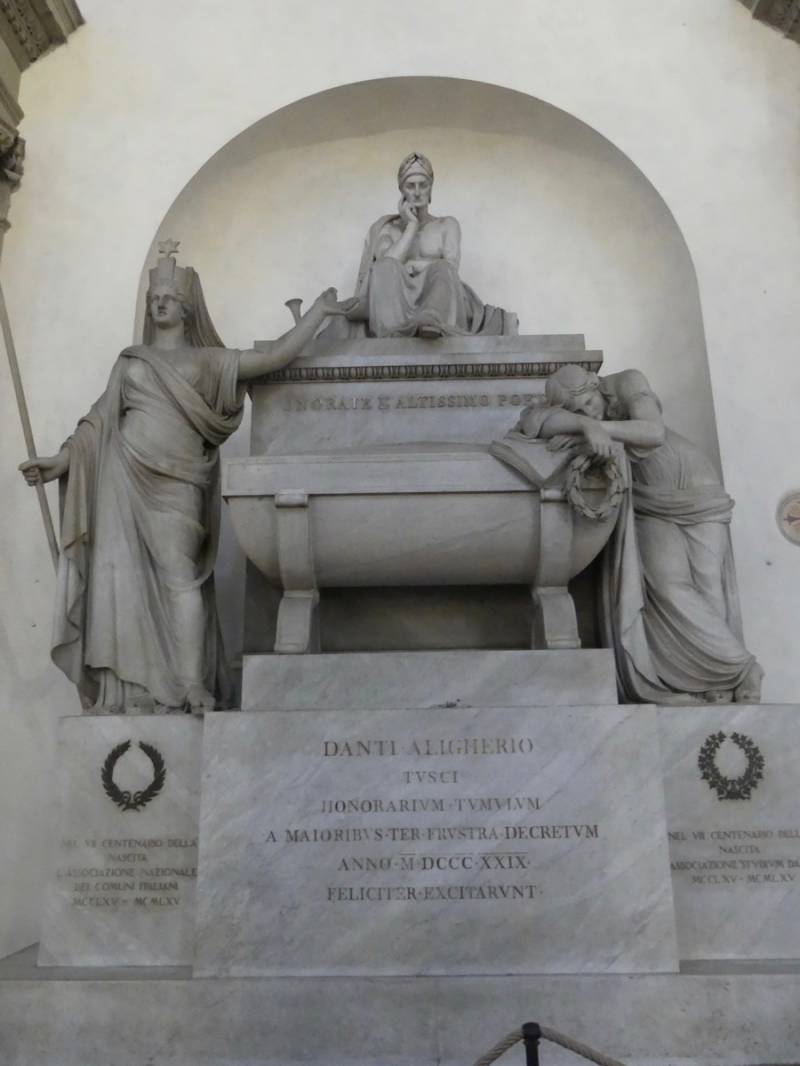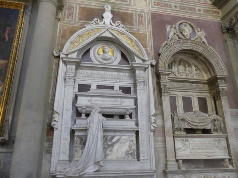 We trotseerden de wachtrij voor de kassa en waren binnen 15’ in de kerk die erg mooi is. Hij is bekend omdat er bekende inwoners van Florence hun laatste rustplaats hebben in praalgraven, zoals de veelzijdige wetenschapper Galileo Galilei, de o.a politiek filosoof en militair strateeg Machiavelli , de componist Rossini , de o.a. beeldhouwer en kunstschilder Michelangelo en van de schrijver en dichter Dante is er een gedenkteken omdat hij elders begraven ligt.