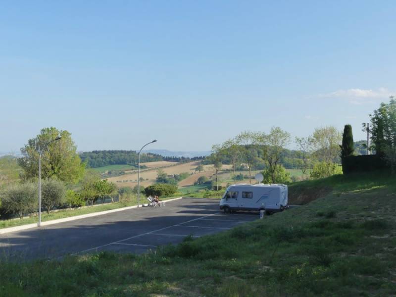 Hoewel het maar ongeveer 110km was naar Monte San Savino, deden we er toch nog ruim 2 uur over. Dat kwam voornamelijk door de laatste 25 km toen we via, overigens een mooie route door het Toscaanse heuvel landschap, een bochtige weg reden naar Monte San Savino waar we nu onderaan het stadje op een camperplaats staan.