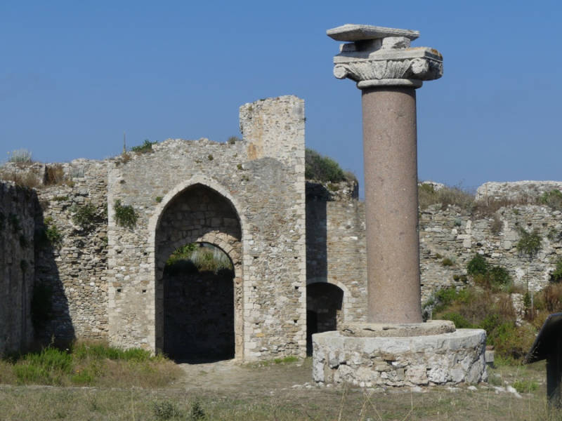 Nog even terug komen op het bezoek aan de vesting in Methoni gisteren. Er stond een pilaar die er later neergezet is, deze is afkomstig uit het wrak van een schip die vergaan is bij voor de kust van Methoni. Deze granieten pilaar, hoogte 3,76m, moet toch een flink gewicht hebben. Dat moet in die tijd, omstreeks het eind van de 15e eeuw, een hele klus zijn geweest omdat dat gevaarte van de bodem te lichten en aan land te brengen.