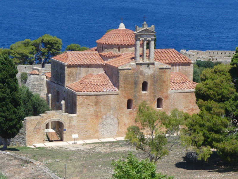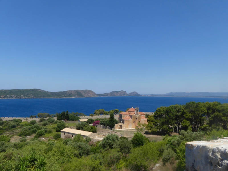 We kijken uit op het langwerpige eiland Sfaktiria dat in de baai van Navarino ligt en zo een natuurlijke haven van Pylos vormt. Pylos, wat toen nog onbewoond was, is door de Turken tot oorlogshaven gekozen en werd er na 1571 een fort gebouwd.