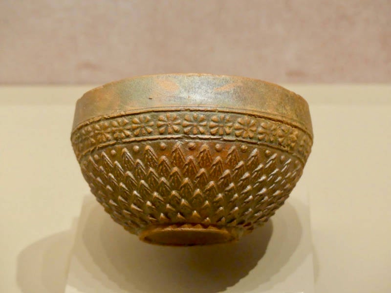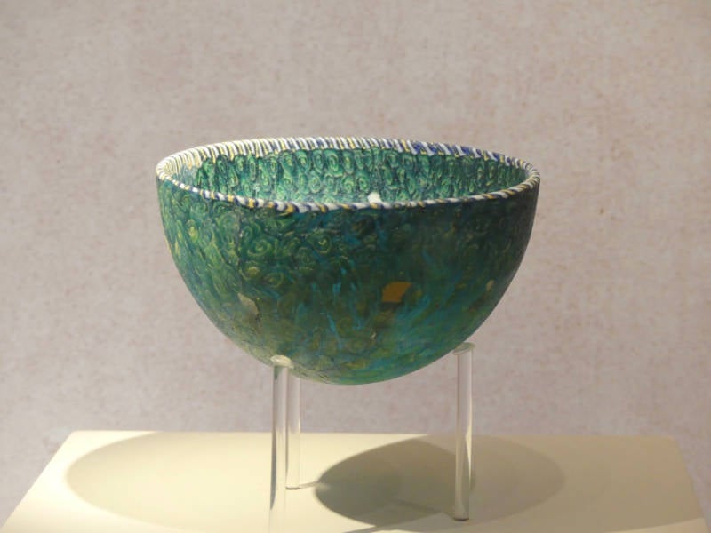 drinkkom van glas 3e tot 1e eeuw v. chr. gedecoreerde drinkkom met band van rozetten 2e tot 1e eeuw v.chr.