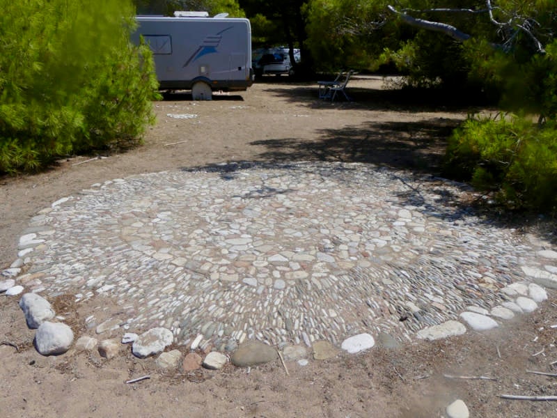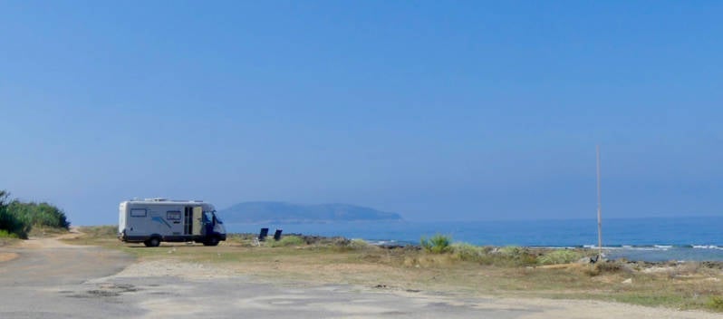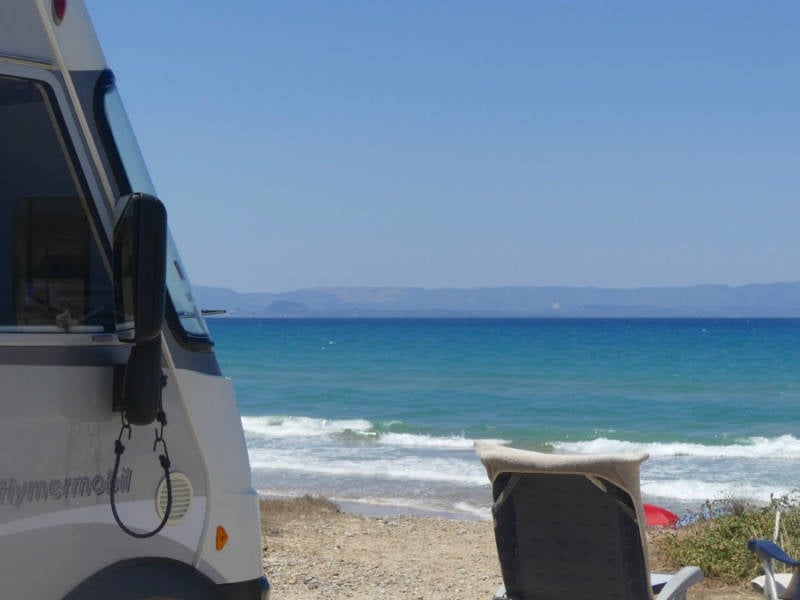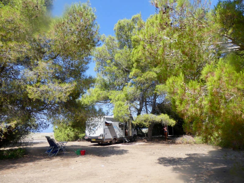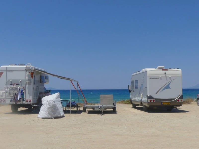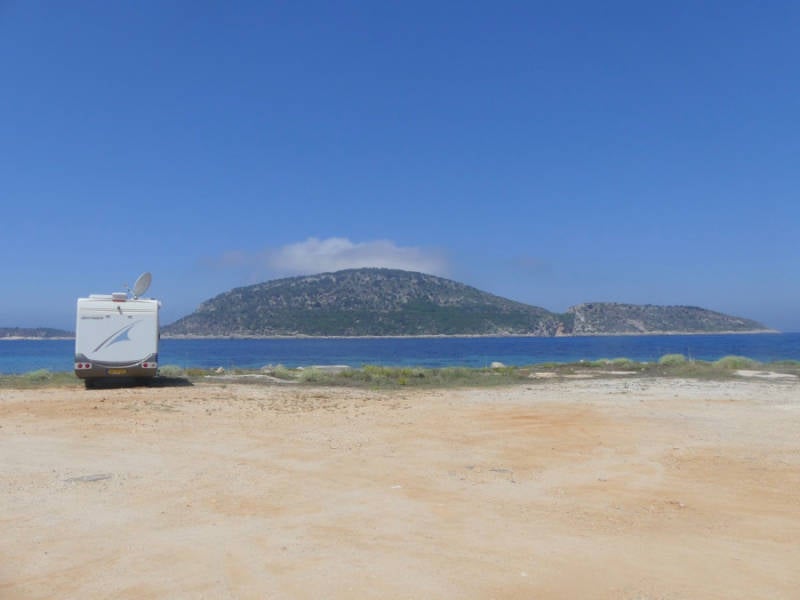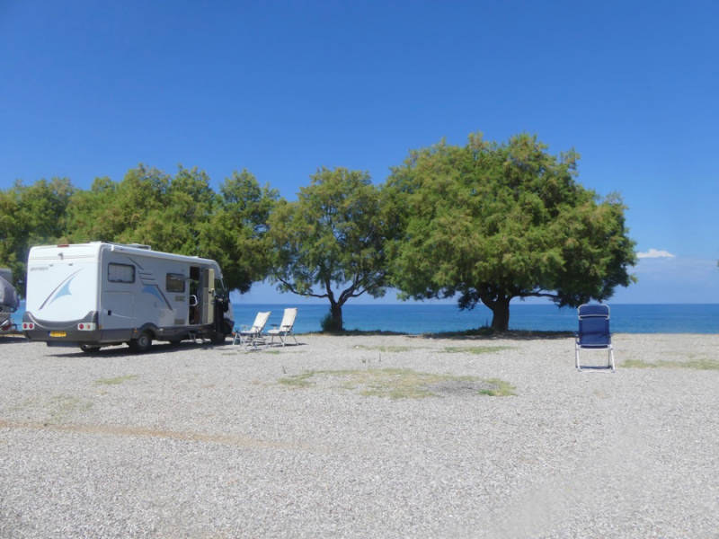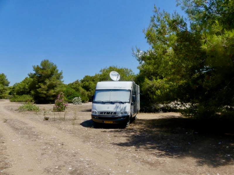Nog zo’n ongeschreven regel: ga niet te dicht boven op elkaar staan. Aan het begin van de middag was er een gebeurtenis die wel bedoeld leek om ons stof tot schrijven te geven, een realiteit waar we graag gebruik van maken. We stonden tussen een Franse camper en een kleine Oostenrijkse camper gebouwd op een klein Mitsubishi busje L300 of zoiets. Daarnaast stond weer een Italiaanse Hymer camper. De Oostenrijkers vertrokken en er kwam een grote Adria alkoof camper voor in de plaats, behoorlijk dicht boven op de ander. De Italianen van de Hymer camper komen terug van een wandeling en het ontaardde in een verbaal gevecht waarbij ze ook nog eens dreigden om elkaar te lijf te gaan. Uiteindelijk is de Hymer met een kwade kop vertrokken. We begrepen dat de Hymer kwaad was geworden omdat de Adria er te dicht boven op was gaan staan. Overigens de 2e keer in Griekenland dat er wat trammelant waarbij Italianen bij betrokken zijn, een temperamentvol volkje.