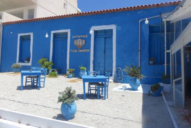 Hebben we gisterenavond al bij het hotel een ouzo met wat heerlijke mezes ( de Griekse tapas) genuttigd, vanavond hebben we onze bijdrage aan de Griekse economie gegeven door een biertje te drinken bij een taverne hier vlakbij. Want met weinig wind en ruim 29º was het een dorstig weertje vandaag. De taverne was aardig trendy ingericht met bijbehorende loungemuziek.Wel een verschil met het tamelijk chique hotel van gisteren, we voelen ons meer thuis in de hippe tent van vandaag.