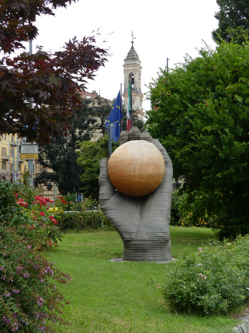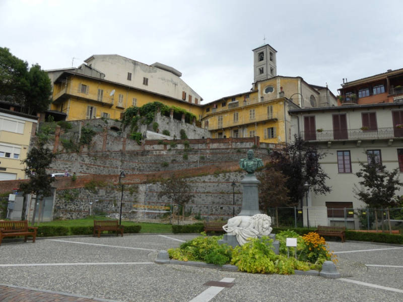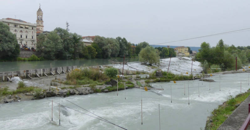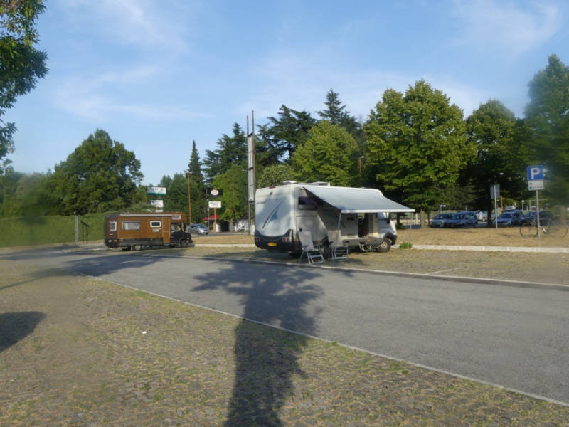 Nu staan we in Ivrea (Piemonte) op een kleine, volle camperplaats, met smalle plekken, gescheiden door een parkje van een rivier met een erg brede waterval, waar je ook kunt raften. De camperplaats staat Italiaans vol, deur aan deur. Een mooie omgeving hier aan de voet van de Alpen ten noorden van Turijn.