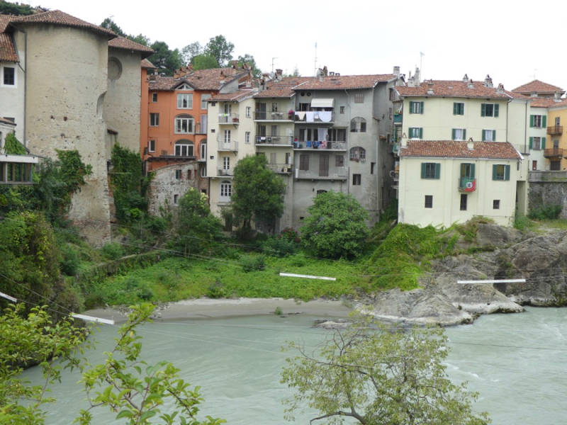 het aardige stadje Ivrea met zijn brede waterval, ligt er nu wat sombertjes bij door lichte regenval