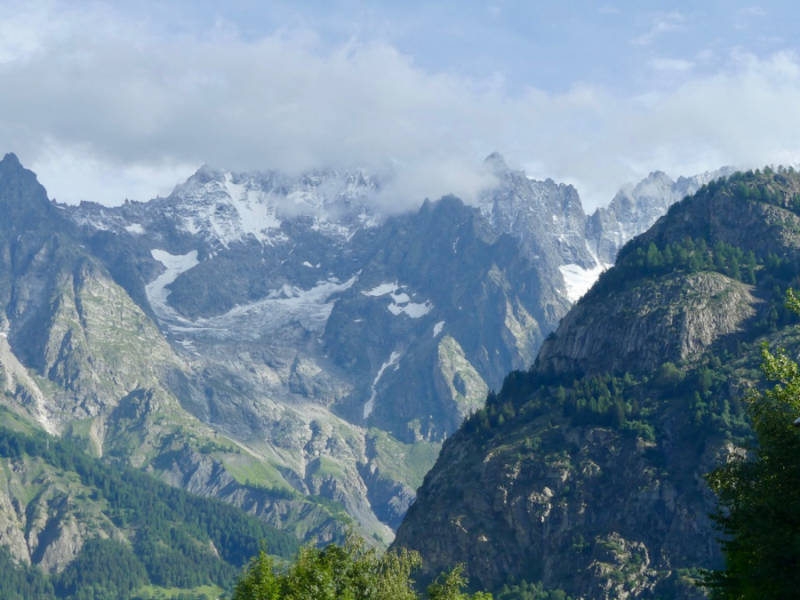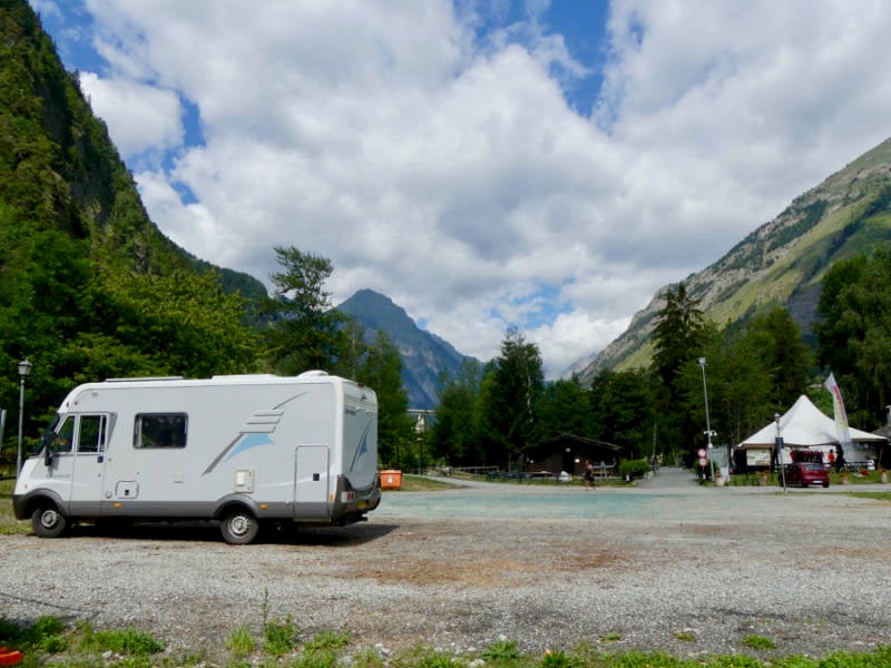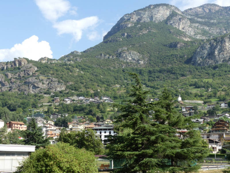In plaats daarvan zijn we in Italië gebleven, we staan nu aan de voet van de MontBlanc in de Aosta vallei. We zijn via de tolweg naar Morgex gereden, door een aantal lange tunnels van zo’n 3 km lengte. Daarom was de prijs van de tolweg er ook naar, €21,50 voor 100 km, duur dus. De weg hier naar toe was schitterend door de Valle d’Aosta, hoge bergen met dorpjes tegen de bergwanden aan.
