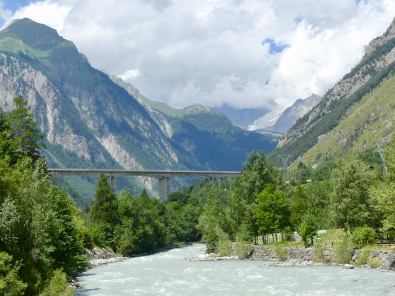 de rivier de Bora Baltea stroomt langs de cp in de verte zie je een gletsjer op de Mont Blanc