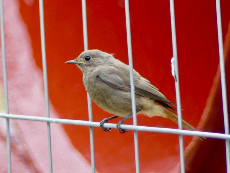 op het hek naast de camper zat vanmiddag een jonge zwarte roodstaart ( nog een beetje geel aan de wortel van de snavel )