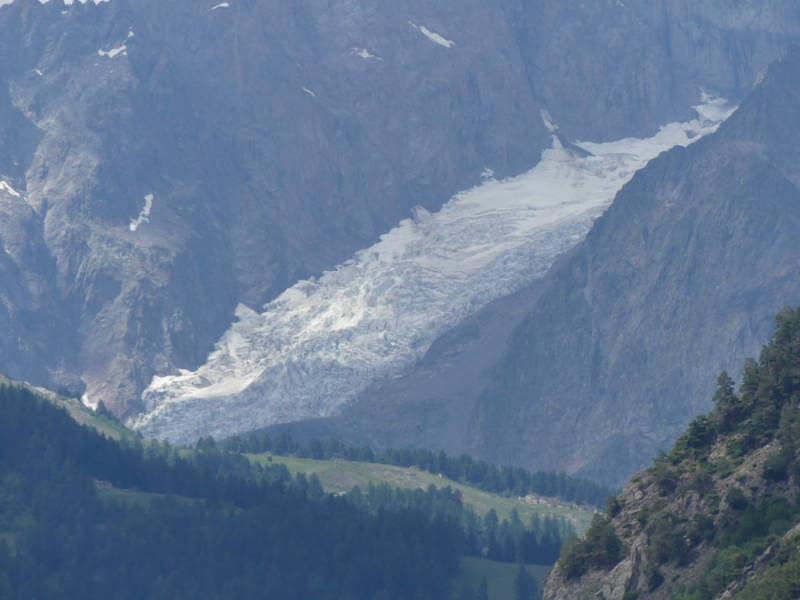We zien vanaf de cp een gletsjer op de `Mont Blanc liggen, de rivier de Dora Baltea ontstaat door een samenvloeiing van 2 gletsjerrivieren van de Mont Blanc en stroomt door het dal van Aosta om na 160 km uit te monden in de Po.