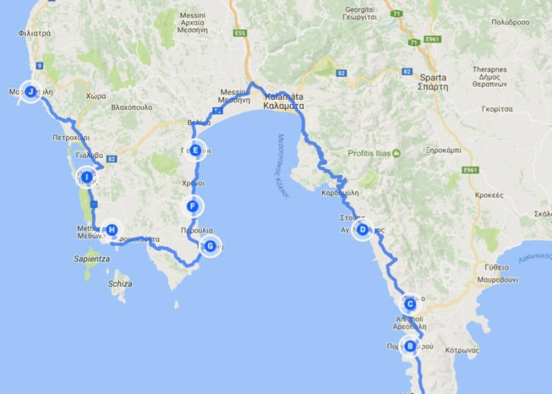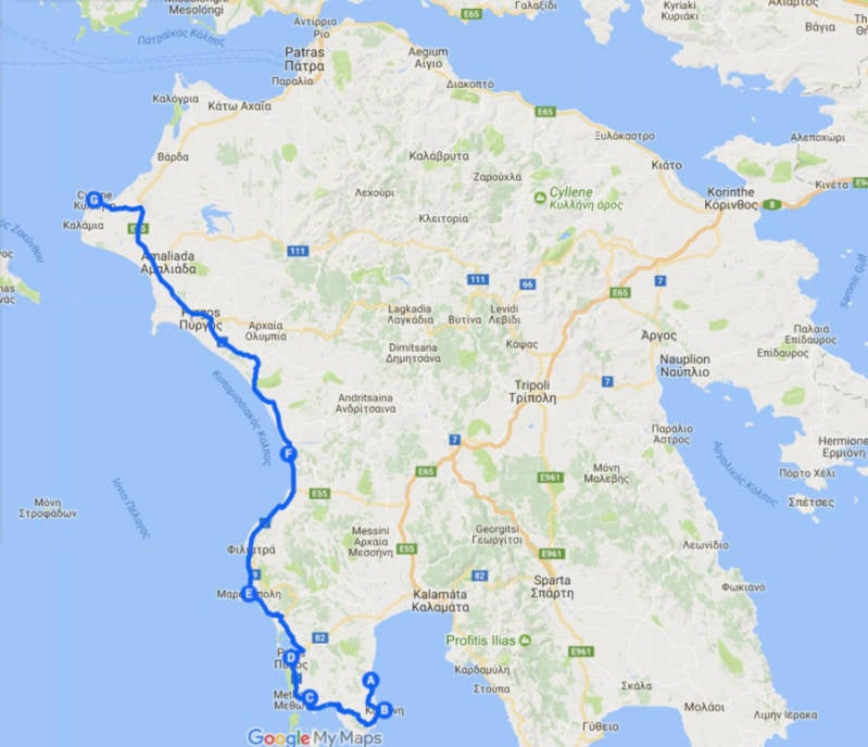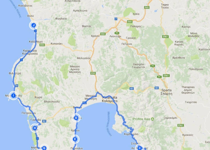 Vandaag van Pylos (I) naar Marathopoli (J) gereden, nog geen 40km