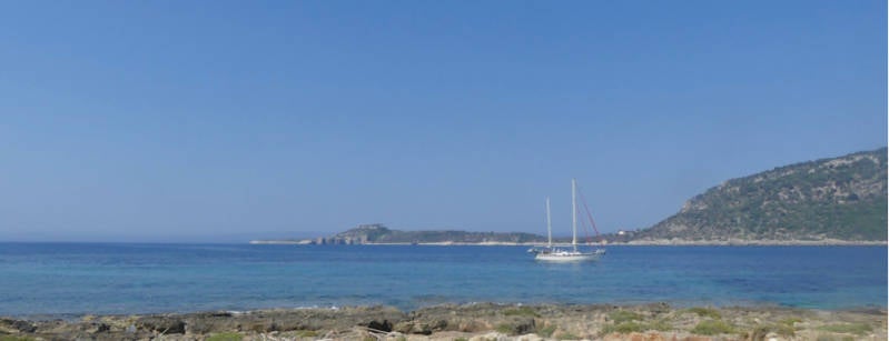 In de zee tussen het eiland en het vaste land komt af en toe een jacht voorbij en regelmatig een zeilboot. Vrijwel allemaal varen ze op de motor omdat er nauwelijks wind is vandaag.
