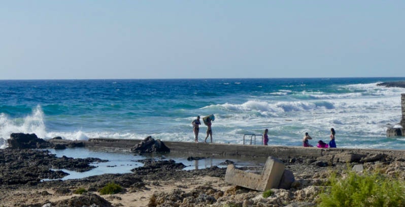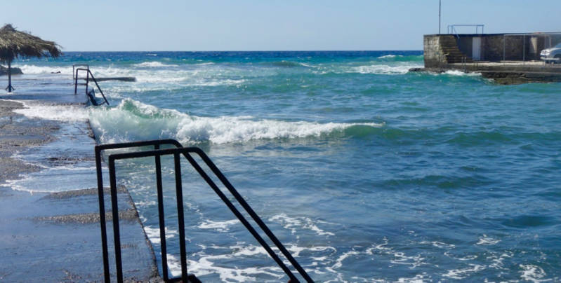 Pas om een uur of 3 werd het zonnig en kwamen er wat mensen om te zwemmen die echter snel het water uit kwamen toen het begon te waaien. Er kwam een flinke golfslag zodat het te gevaarlijk was om in het haventje te zwemmen. Wel lieten kinderen zich op de kant nat spatten door de golven die tegen de kant beukten. Het was mooi om te zien hoe het water steeds hoger kwam voor de camper, waar de holletjes in de rotsen zich weer met water vulden dat de komende tijd weer zal verdampen.