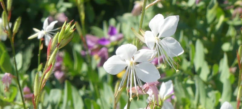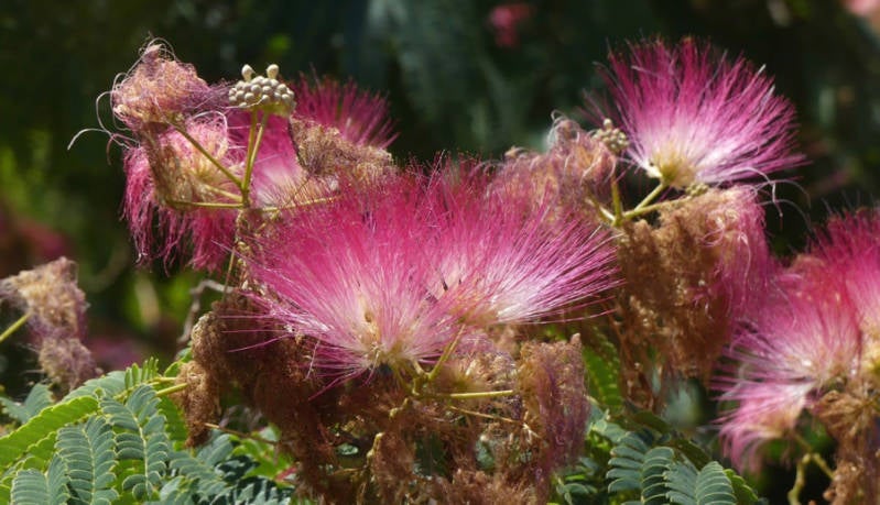 Bovenste foto een gele Brugmansia. De linker foto daaronder een onbekende plant en rechts daarvan een bloeiende boom die we ook in Marokko regelmatig zien