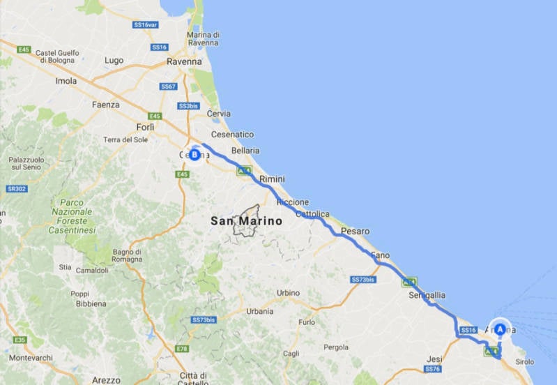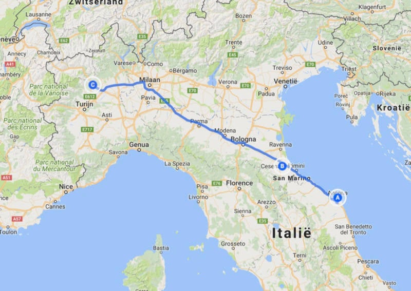 de gereden route vandaag ging van Cesena (B) naar Ivrea (C), 426km over de tolweg, €35,50 tol