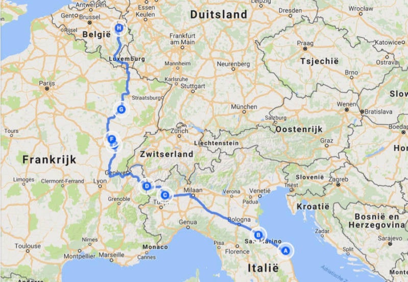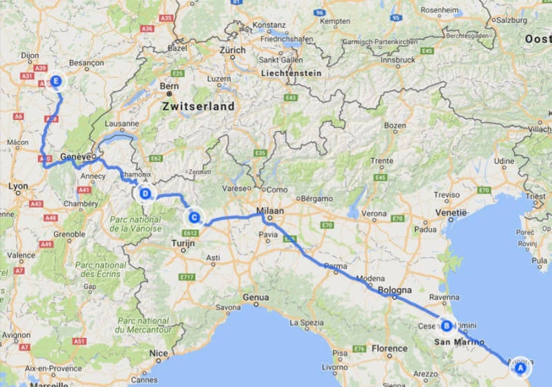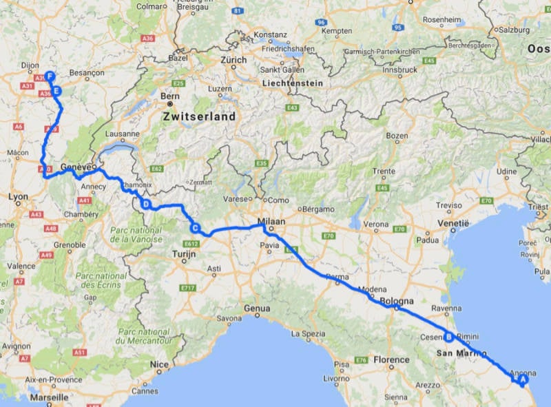 het begint al een traditie te worden, hier weer de gereden route van van daag : van Morgex(D) naar Dole (E), 340km