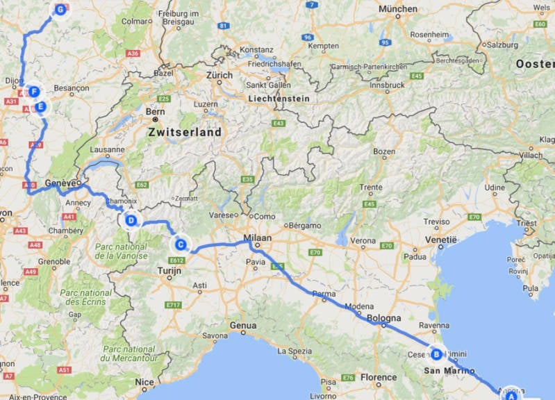 vandaag een korte route i.v.m weersomstandigheden Frankrijk , 100km van Ivrea(C) naar Morgex(D)