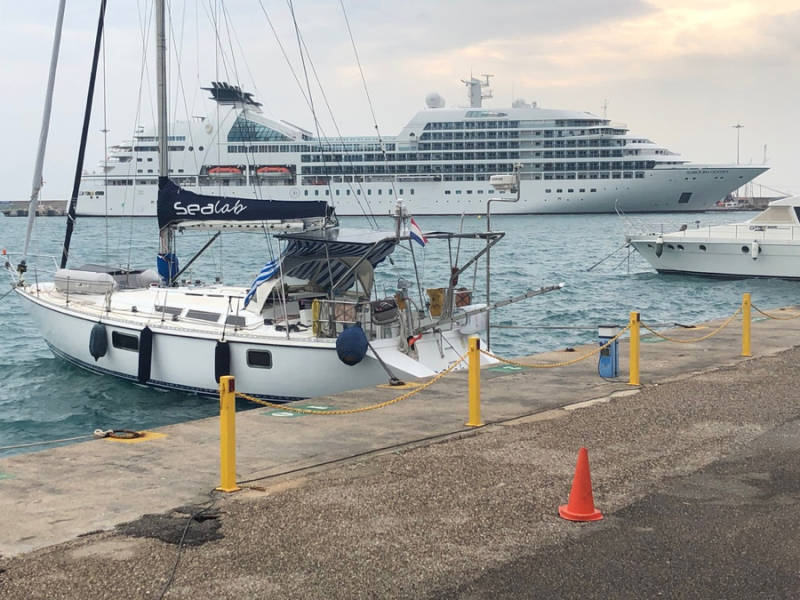 Vanmorgen om 8 uur kwam er een onweersbui, duurde een uur en daarna was het droog tot 12.00uur. Konden we mooi wat boodschappen doen en ook belangrijk, naar het havenkantoor omdat we stroom wilden. De havenmeester was er pas bij ons 2e bezoek, gezien de weersverwachting meteen maar voor 2 dagen stroom genomen, €5,- per nacht.