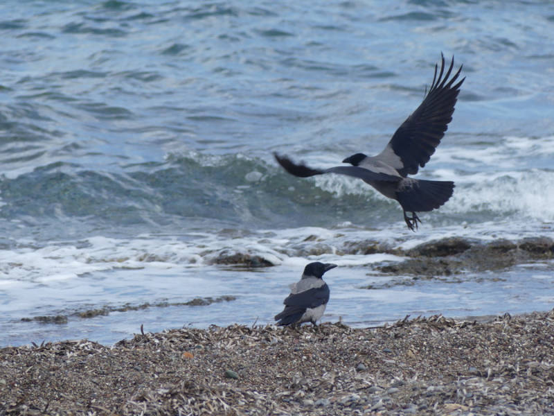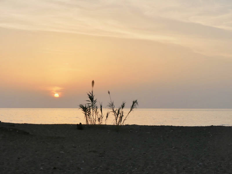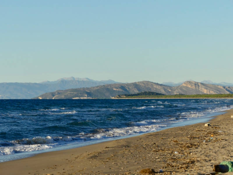 De west kust van de Peloponnesus is weer anders dan de oostkust. Daar liggen talrijke eilandjes voor de kust, langs de westkust wat grotere eilanden. De zee, waar we niet direct op kunnen kijken, behalve als we staan, oogt daardoor wat ‘gewoner’ dan dat we de afgelopen weken gewend zijn geweest. Er zijn hier wel lage lage duinen, dat heeft ook wel weer wat natuurlijk. En na een paar weken staan we sinds gisteren ook niet meer bij een haventje maar midden in de natuur.