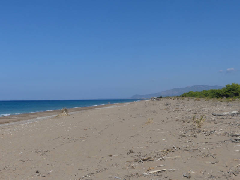 Toen wij hier in Elia voor het eerst kwamen, in 2013, was er sprake van dat hier een luxe bungalowpark zou worden gebouwd. De grond hier was opgekocht door een rijke Russische projectontwikkelaar die plannen in die richting had. Omdat dit niet alleen een prachtig natuurgebied is maar ook een erg belangrijke plek waar de zeeschildpadden Careta Careta, een bedreigde diersoort ,hun eieren leggen op het strand, kwam er een beweging op gang vanuit de plaatselijke bevolking alsmede milieubeschermingsorganisaties. De plannen zijn toen afgeblazen omdat de Rus geen vergunning kreeg. Er is toen een vereniging opgericht, ‘de Vereniging van Vrienden van het bos en strand van Elia’. Deze houdt zich bezig met het verdedigen van de belangen van het bosgebied, houden strandschoonmaakacties van het strand en planten nieuwe dennen aan. Een van de oprichters van de vereniging is regelmatig in zijn caravan in het bos aanwezig, we hadden graag een praatje met hem gemaakt maar hebben hem niet getroffen.