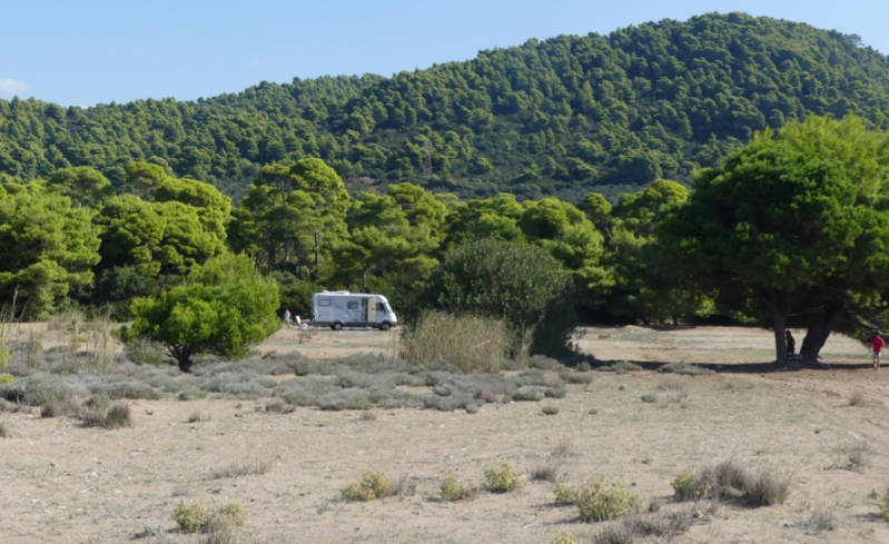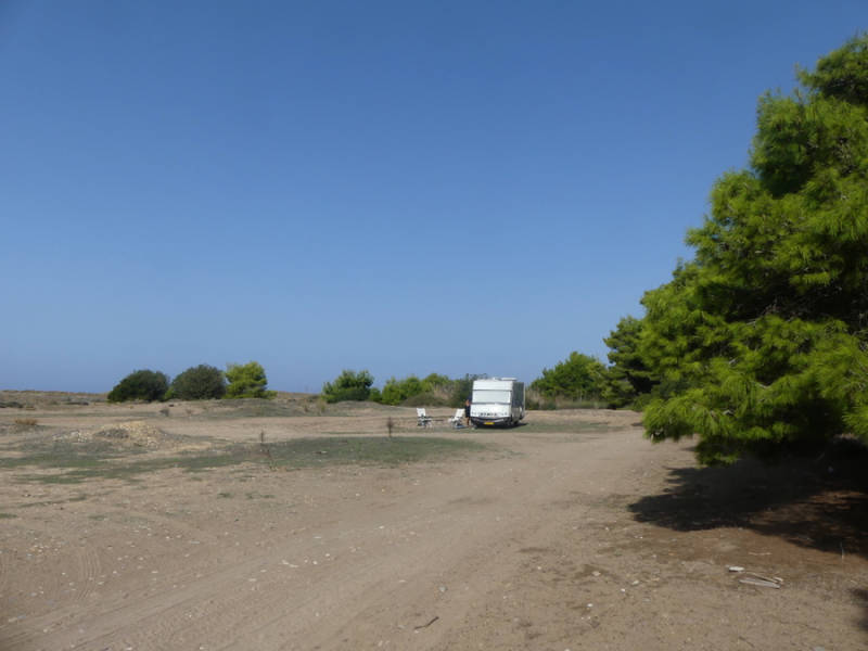 Het was maar 11km naar Eliá waar we nu in het pijnbomenbos staan. We hebben hier meerdere malen gestaan, het is één van onze favoriete plekken in Griekenland. Het strand is 200m verwijderd, zijn een aantal douches met watertappunten in het bos, er is een goed restaurant in de nabijheid. We hebben hier een optimaal gevoel van vrijheid, het naturistengedeelte van het strand is hier vlakbij.