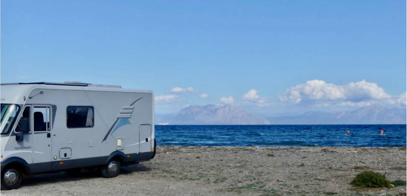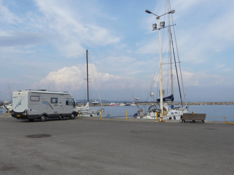 Naast ons staat een camperforumlid, Martin, die we al eens in Platja d’Aro hebben ontmoet , een leuke man waar we ervaringen mee uitgewisseld hebben. Hij is met een mooie grote camper, een Clou met aanhanger met een elektrische Smart erop. Iets verderop staat een Nederlandse camper, we hebben deze mensen al 2x eerder ontmoet in Griekenland.