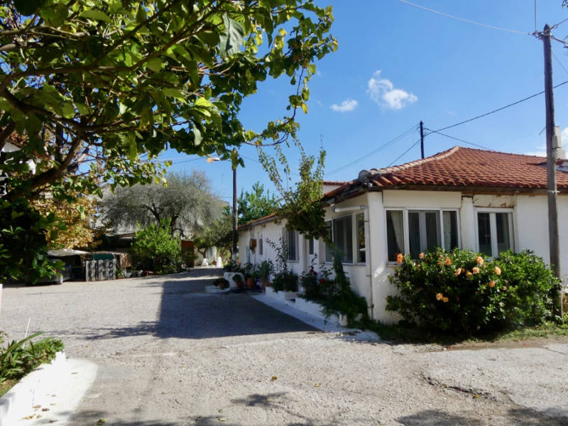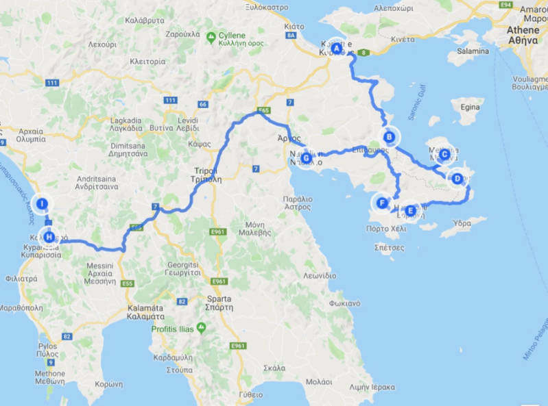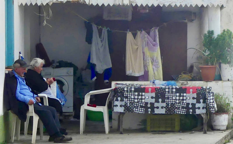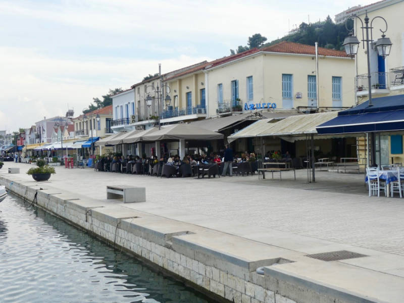 We zijn vanmorgen vertrokken nadat we Jorgos en zijn vrouw hartelijk hadden bedankt voor de gastvrijheid op hun fijne plek. We kwamen door een paar dorpen waar herdenkingsplechtigheden aan de gang waren. We moesten nog 2,2 km rijden naar onze plaats van bestemming toen in een stadje de doorgaande weg was geblokkeerd. We werden door de politie een te nauw straatje in gedirigeerd, go, go, we raakten met onze spiegel de spiegel van een geparkeerde auto, toen konden we tussen 2 auto’s door. Via allerlei smalle straatjes waren we het stadje uit en konden we opgelucht adem halen niet wetende dat er nog meer ellende ons te wachten stond. De afslag naar het dorp waar we toe wilden genomen en TomTom stuurden ons een steeds smaller wordend weggetje in. “Dit kan toch nooit de weg naar de haven zijn “, zei Everdien wat ik alleen maar kon beamen maar terugkeren was niet mogelijk. Dus gingen we stapvoets zeer steil naar beneden om uit te komen op een pier, aangestaard door verbaasde vissers. Daar konden we met enige moeite keren en werden teruggestuurd, nu dus de zeer steile weg omhoog, blij met onze achterwielaandrijving, anders had het niet gekund. Linksaf zei Tomtom na 50m, het was niet alleen steil naar beneden nu maar ook nog eens een haakse bocht, we dachten om te slaan, hartkloppingen waren het gevolg. Opnieuw een moeizame afdeling door een zeer smal straatje, kwamen uit bij de receptie van een klein hotel om vervolgens bij de zee aan