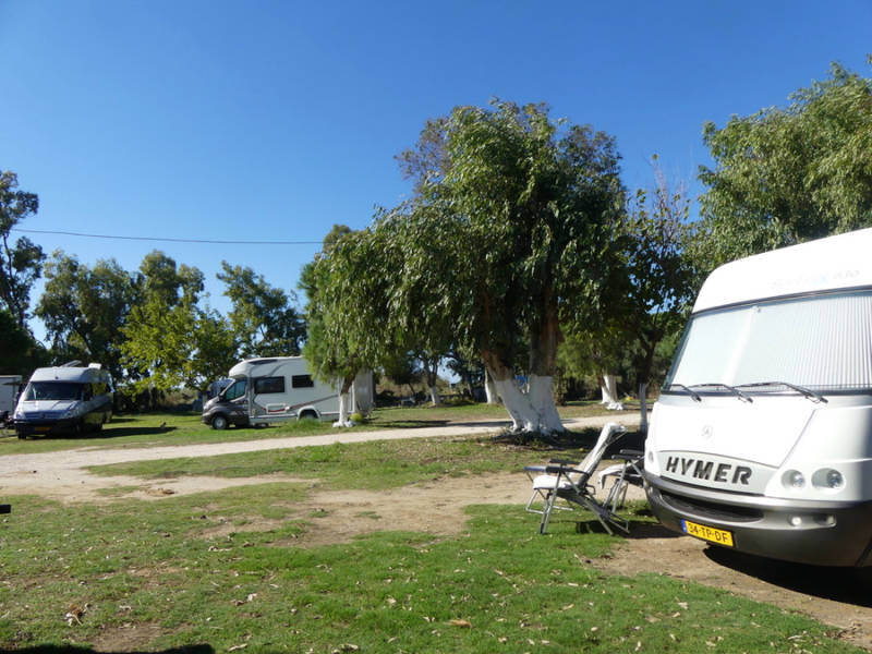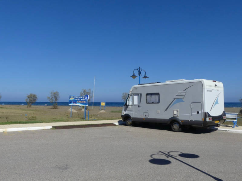 Toen we vlakbij de camperplaats kwamen, liepen Tonnie en Johan over de weg te wandelen, het oudere echtpaar die we al een paar x hadden ontmoet, ze bleken er ook te staan. En inderdaad we vinden het een hele leuke plek, we werden verwelkomd door een Belgisch echtpaar wat hier een half jaar staat, ze zijn marathonlopers. Een beetje kneuterig , een beetje rommelig en met een erg vriendelijke eigenaar, Jorgos. Er zijn voorzieningen, je kunt zelfs stroom krijgen als je zou willen, dat is dan het enige waar je voor moet betalen, de rest is gratis. Je bent niet verplicht om er te gaan eten, iets wat we uiteraard morgen wel gaan doen, we zijn geen profiteurs.