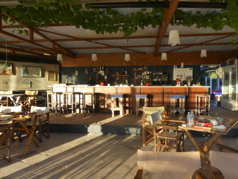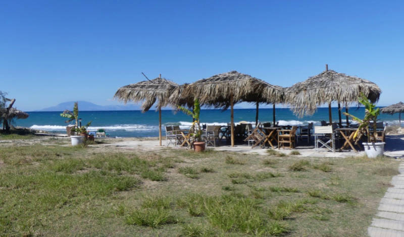 via de tuin achter het restaurantje kom je bij het strand, voor de kust ligt he eiland Kefalonia