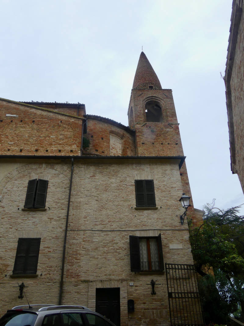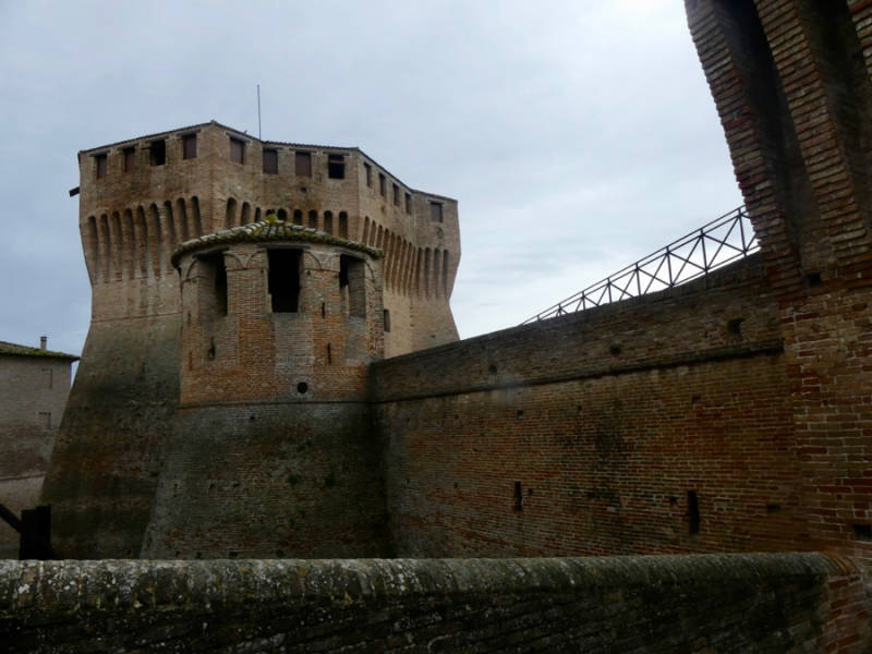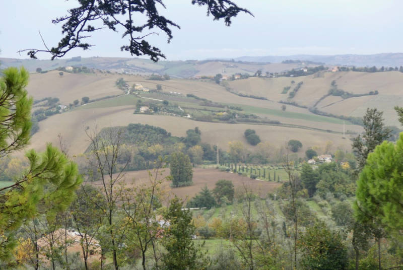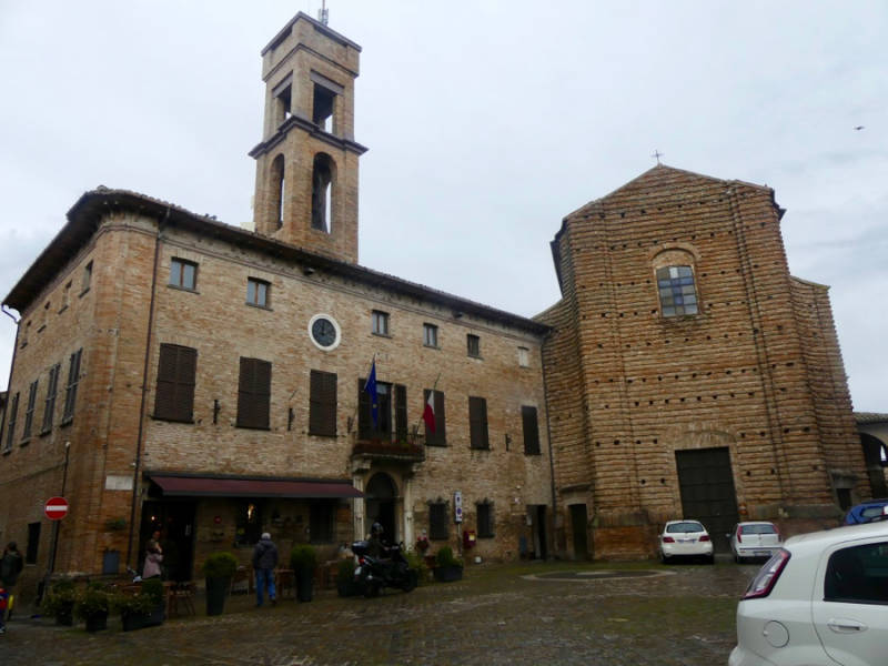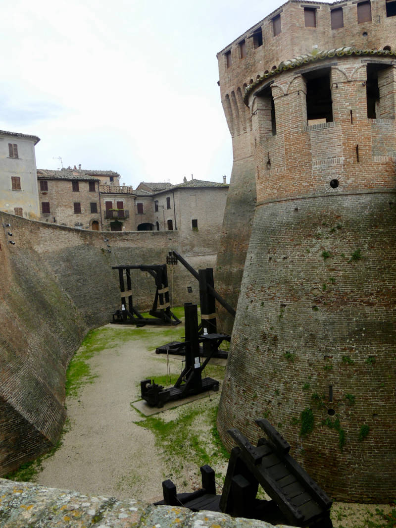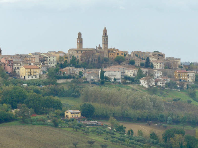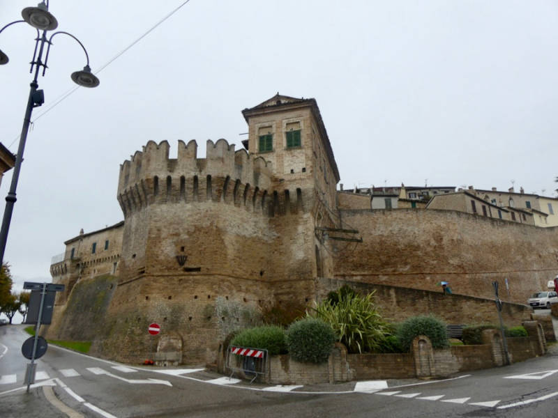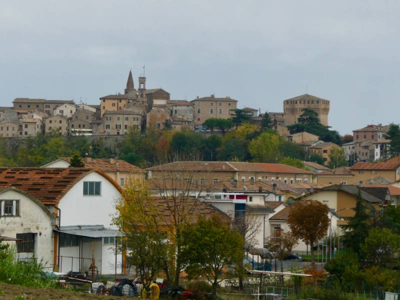 En het werd warempel ruim een uur droog zodat we het middeleeuwse centrum konden bezoeken. Het wordt gedomineerd door het fort ‘Rocca’ uit de late middeleeuwen (14982-1492), Een heel leuk stadje, we moesten wel een beetje snel zijn want er kwam weer een nieuw regengebied aan. Maar we hebben door de leuke straatjes geslenterd en de sfeer kunnen opsnuiven. En wat een mooie vergezichten, over het prachtige heuvelachtige landschap met dichtbij nog een leuk dorp en met herfstkleuren, die hadden we in Griekenland nog niet gezien. Al met al een mooi alternatief voor Corinaldo.
