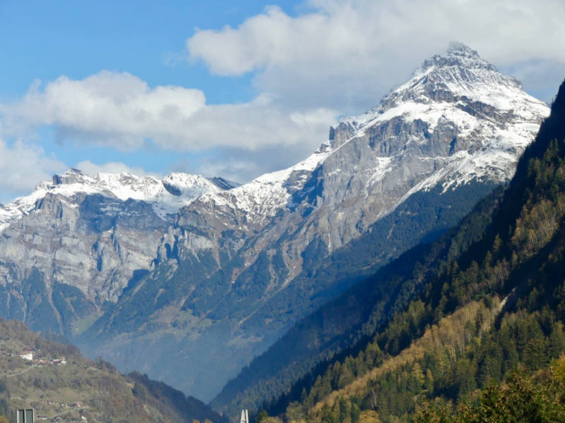Maar we moeten verder kijken dan alleen de mediterrane landen waaraan we ons hart verpand hebben en daarom zijn we even weg van de snelweg gereden. We hebben ons beeld al gedeeltelijk bijgesteld, we vonden de boerderijen mooi, veel bruin hout, wel wat somber , maar als de zon had geschenen hadden we het landschap ook meer kunnen waarderen. Want we vonden het landschap, even afgezien van de clichés van de besneeuwde bergtoppen, mooi. De heuvels waren bedekt met veel sparren, maar ook met bomen in prachtige herfstkleuren . En gelukkig hadden lang niet niet alle koeien koebellen om.