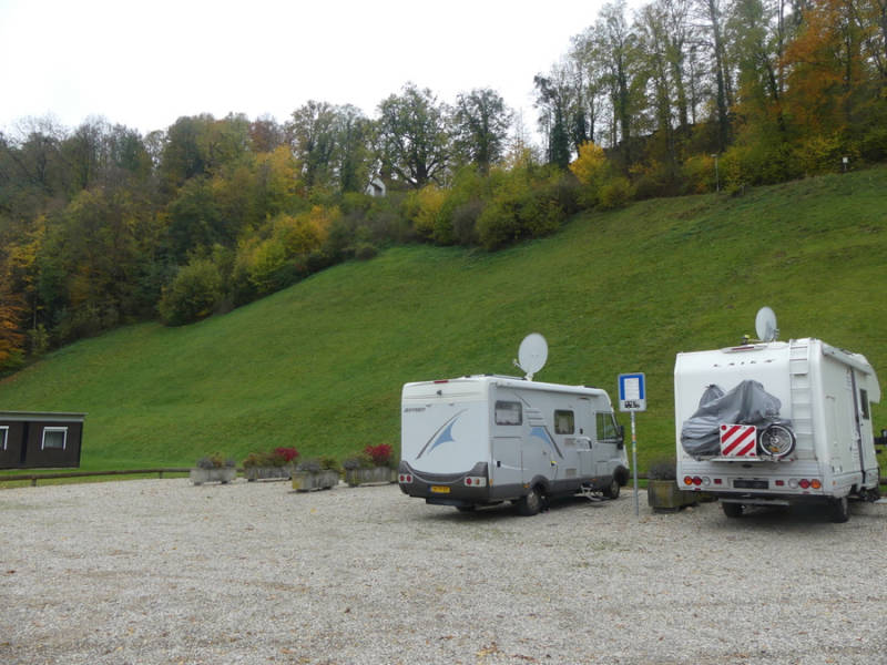 Omdat het zaterdag was, was er vrijwel geen vrachtverkeer zodat het verkeer rond Milaan lekker doorstroomde. We waren dan ook snel bij de Zwitserse grens waar we een vignet kochten, die was weer €2, -duurder geworden, nu €42,-.. We waren de grens nog niet over of het begon flink te plenzen. Gelukkig duurde het niet al te lang en voor de Gotharttunnel werd het zelfs droog. We hebben getankt voor €1,76 per liter en we kochten een biologisch stokbrood voor €4,32., Zwitserland is een duur land. Toen we de 17km lange tunnel uitkwamen scheen de zon nog even en zagen we mooi de sneeuw op de bergen liggen. Helaas werd het weer zwaarbewolkt , en dat bleef het tot we op de cp in Willisau kwamen, 300 km gereden vandaag.. Deze plaats ligt vlakbij het centrum naast de brandweerkazerne en de prijs valt hard mee voor zo’n duur land. Het kost hier omgerekend maar €4,33 inclusief stroom. Die kunnen we wel gebruiken, de 3e dag op rij dat we geen zon hebben.
