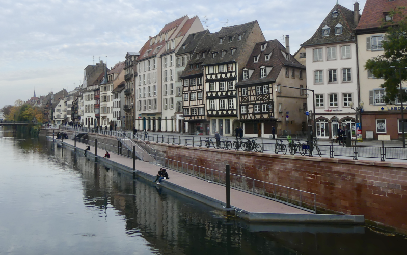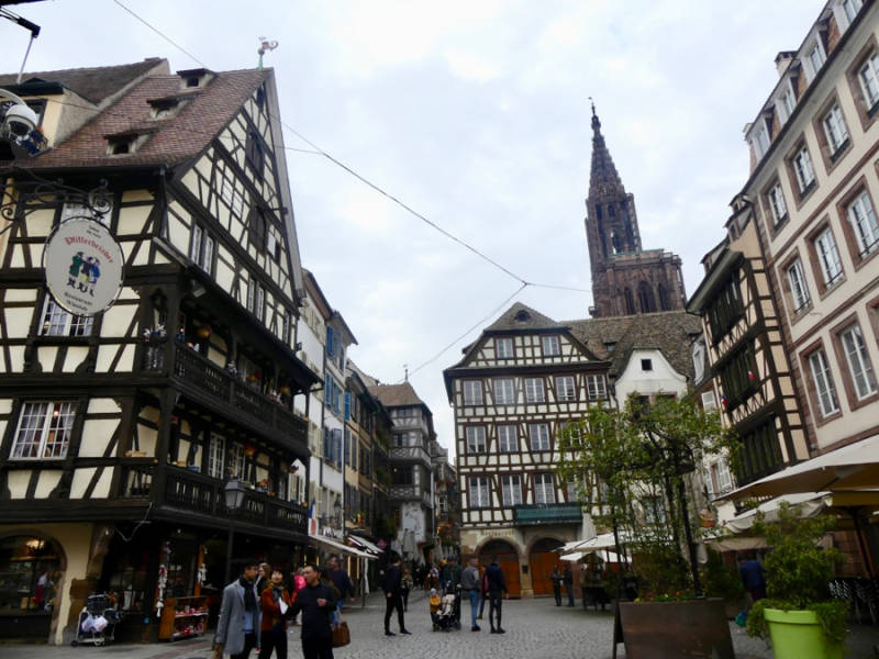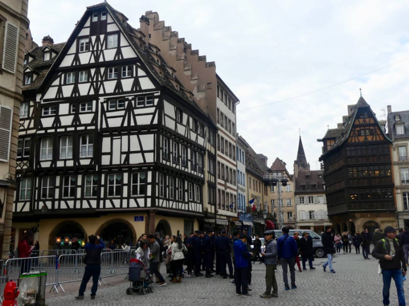 Het blijkt dat het honderd jaar geleden is dat de 1ste wereldoorlog is geëindigd, op 11 nov 1918 kwamen de strijdende partijen een wapenstilstand overeen, Macron houdt in het kader daarvan een tournee door het noorden van Frankrijk en die begint vanavond in Straatsburg met een ontmoeting met de Duitse president Steinmeier. De partij van Macron, la République en Marche, heeft opgeroepen om vandaag massaal naar Straatsburg te komen. Of het daarom zo druk is weten we niet, Straatsburg bruist altijd wel omdat het een studentenstad is. Je zag trouwens ook veel arme sloebers, al dan niet met drankneus, bedelend of in vuilnisbakken schuimend, de keerzijde van een welvaartsmaatschappij, daarbij zijn ook de nodige schizofrenen trouwens.