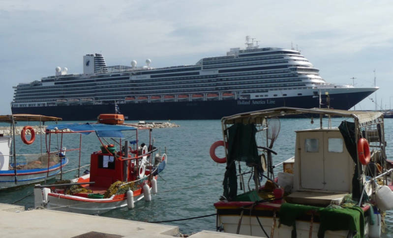 Vanmorgen om een uur of negen kwam er een cruiseschip de haven binnengevaren. De haven hier is ooit gebouwd voor de uitvoer van krenten, tegenwoordig meren hier cruiseschepen aan waarvan de passagiers dan met bussen en taxi’s naar Olympia worden vervoerd. Dan zijn alle winkeltjes, met hun aanbod gericht op de passagiers, ook open. Zodra een cruiseschip vertrokken is, sluiten de winkeltjes weer.