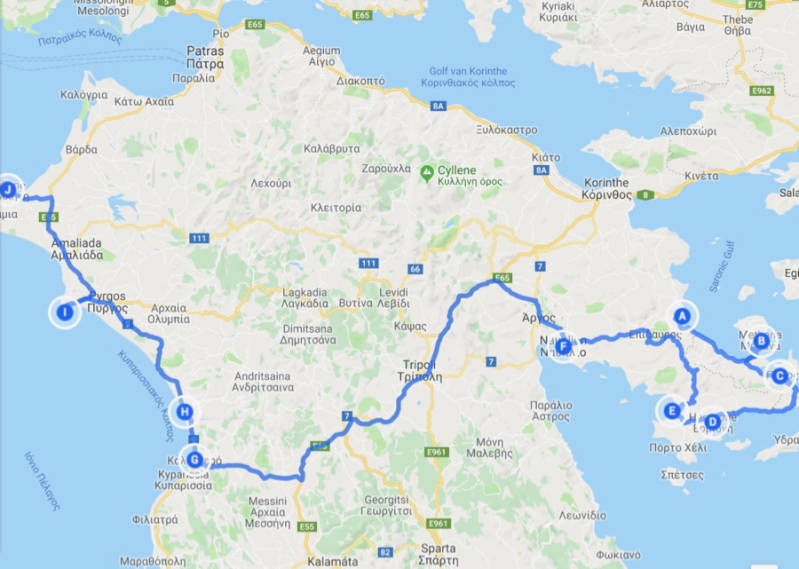 te komen, we stonden in de tuin van een verlaten hotel , we zagen de haven liggen , echter het weggetje was afgesloten door een hek met slot. Aan de andere kant van het hek stond een automobilist, wie heeft de sleutel meneer? U moet omdraaien en weer terug zei hij tot onze schrik. We moesten niet eens huilen maar begonnen gelaten aan de hachelijke klim naar boven waarbij de haakse bocht naar boven minder moeilijk was. En gelukkig geen tegemoet komend verkeer, niemand is natuurlijk zo idioot om zo’n weggetje te rijden. Er bleek een redelijke weg naar het haventje te lopen waar we nog nazwetend van de spanning gingen staan. Een haventje van het wat armoedige vissersdorp Alykes, met kleine schilderachtige huizen. We staan bij het haventje, 20 m van de zee, en kijken over de Golf van Patras naar Kryoneri aan de overkant van de baai waar we al eens gestaan hebben 5 jaar geleden. In de verte zien we Patras liggen en we zien ook de brug over de Golf van Patras die verderop de Golf van Korinthe gaat heten Er varen hier ferry’s voorbij van en naar Patras dat hier nog 23km vandaan ligt.