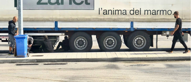 In de haven , net als vorig jaar , weer een kat en muisspel tussen politie en een groep vluchtelingen? Die probeerden om in of onder vrachtwagens te komen. Op een gegeven moment vluchten ze het hek over om in het gebouw en op het dak van een leegstaande fabriek te gaan zitten, het was een groep van ongeveer 15 jongeren..