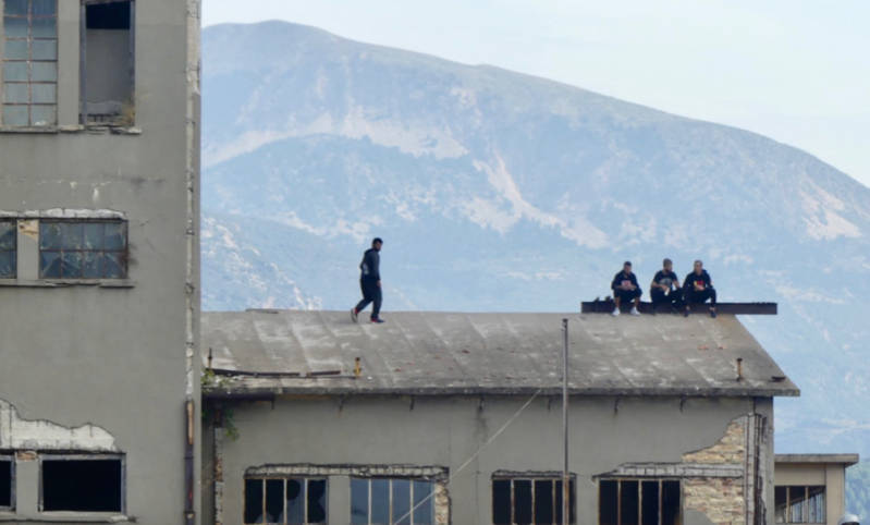 Jongeren proberen onder eenv rachtauto te kruipen, later vluchten ze weer over het hek en klommen op het dak van een leegstaand gebouw.