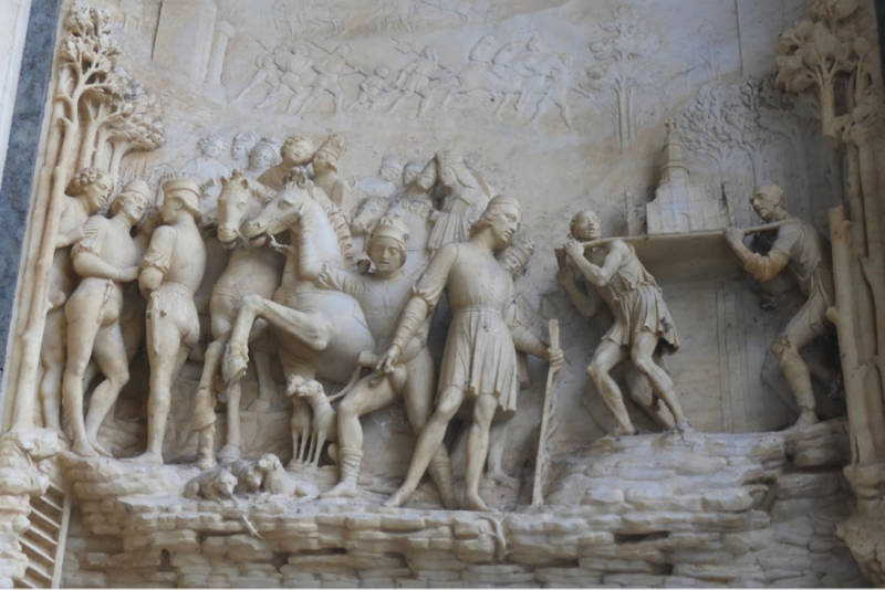 De façade is weer erg indrukwekkend, ze is vol met torentjes, arcades, colonnaden (dat zijn een rij zuilen die een overdekking draagt. Als bouwkundig element gaat de colonnade terug op de architectuur van het oude Griekenland, toch nog een Grieks element zo op het eind van onze reis). en beeldhouwwerken. Het middenportaal is verfraaid met beelden van profeten, het timpaan met taferelen uit het leven van Jezus, vanaf zijn laatste intocht in Jeruzalem tot zijn Hemelvaart. Op het timpaan van het linkerportaal is de jeugd van Jezus afgebeeld tot zijn vlucht naar Egypte. Het rechterportaal laat de Wederopstanding van de Doden en het Laatste Oordeel zien. Onder het grote roosvenster van de westkant van de façade staan vier ruiterstandbeelden. Een schitterend geheel waar weer veel te zien was.