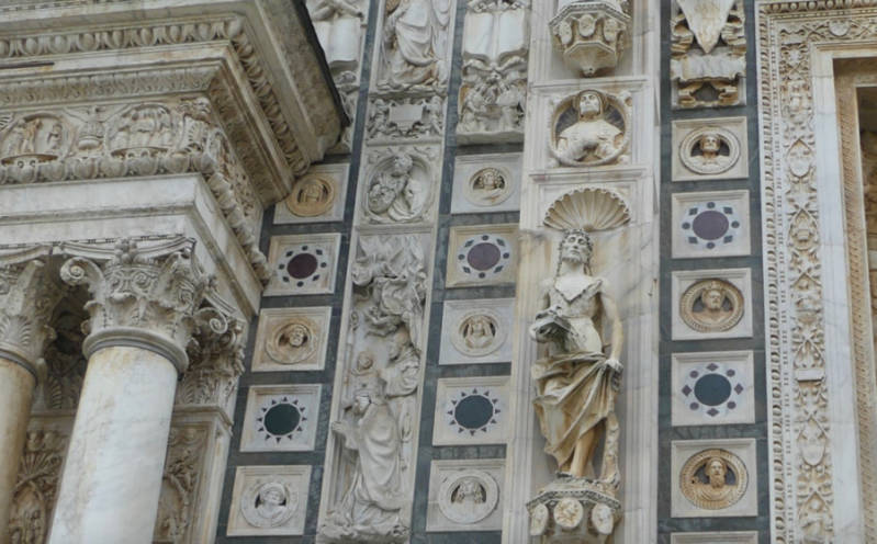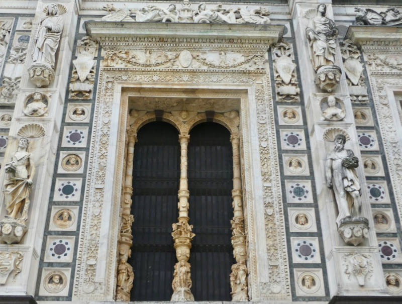 Vanmiddag hebben we het klooster bezocht, de toegang is gratis. De bouw van het karthuizer klooster is begonnen in 1396 en is in Renaissance stijl, het is een uitzonderlijk architectonisch hoogstandje. Toen we voor de voorgevel stonden, hebben we ons vergaapt aan de schoonheid. Van de boven- tot de onderkant is het eigenlijk één reusachtig beeldhouwwerk. Waar je ook kijkt, zie je standbeelden, nissen, sculpturen, zeer fraai bewerkte ramen etc. Dit alles is van marmer en werd tussen 1473 en 1560 aangebracht op de oorspronkelijke bakstenen gevel.