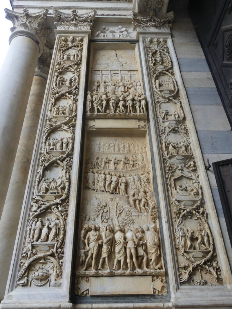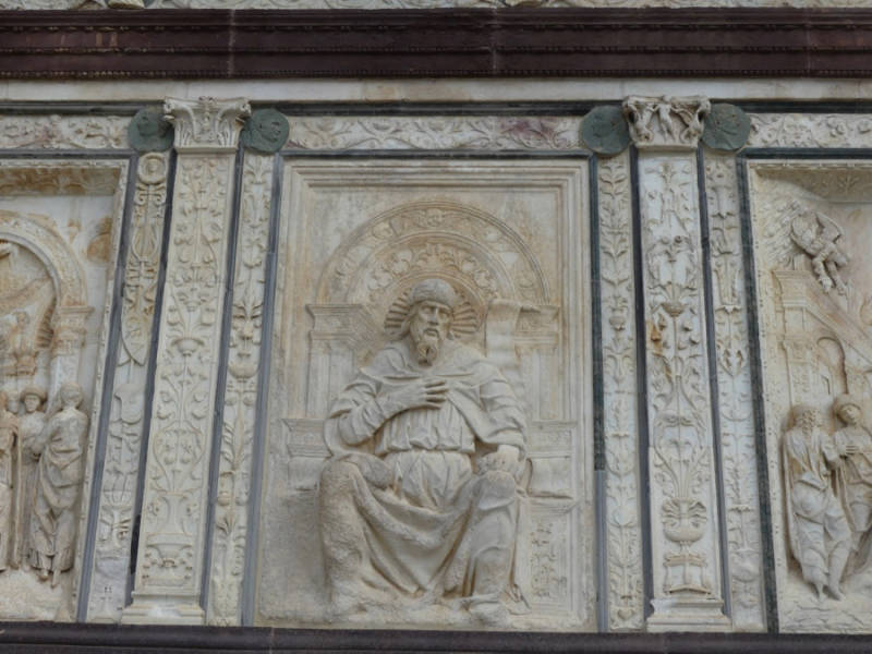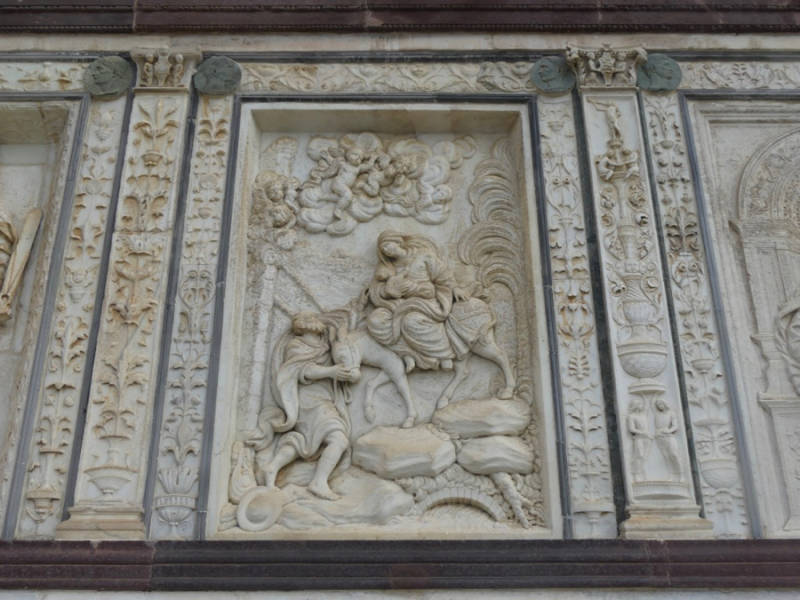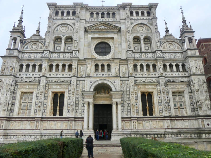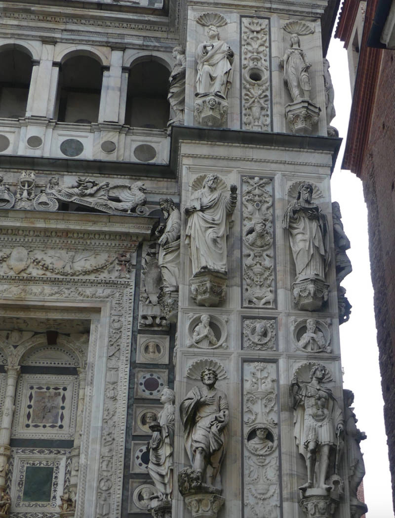 Op onze terugreis uit Griekenland kwamen we bij een klooster die veel indruk op ons heeft heef gemaakt door m.n. de ontzettend mooie facade . Van de boven- tot de onderkant is het eigenlijk één reusachtig beeldhouwwerk. Waar je ook kijkt, zie je standbeelden, nissen, sculpturen, zeer fraai bewerkte ramen etc. Dit alles is van marmer en werd tussen 1473 en 1560 aangebracht op de oorspronkelijke bakstenen gevel.